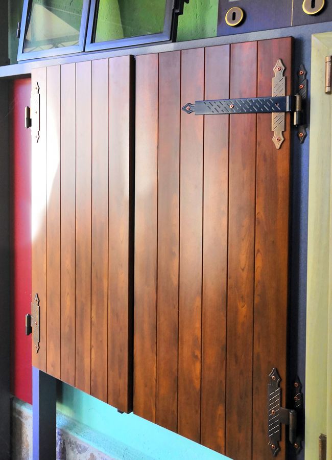 Gli sportelloni autoportanti tradizionali sono realizzati esclusivamente in legno, tipicamente a finitura continua a doghe verticali o orizzontali, ancorati alla parete solitamente con cerniere a vista.